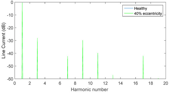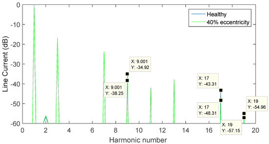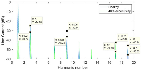 In this operating point, there are significant differences in the third, ninth, seventeenth, and nineteenth harmonics of the line currents, thus enabling the detection of eccentricity faults.
