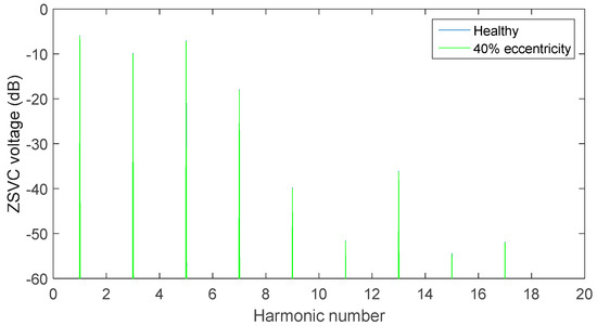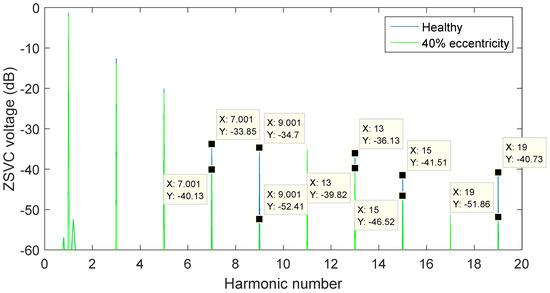 Figure 6 shows the spectral content of the ZSVC of the analyzed fPMa-SynRM under healthy and 40% static eccentricity conditions.
