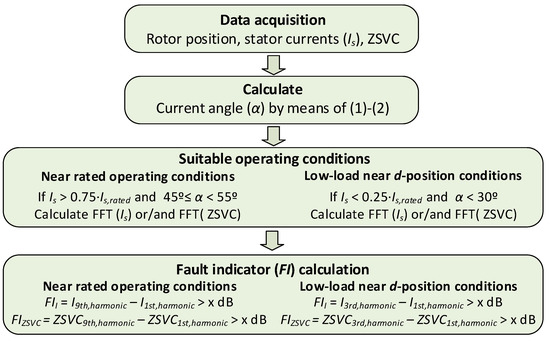 The approach proposed in Figure 11 can be applied for on-line fault detection, since the rotor position, stator currents, and ZSVC can be acquired continuously, and the calculation of the current angle α, the FFT (fast Fourier transform) of the current and ZSVC waveforms, and the fault indicators is very fast. Table 4 and Table 5 summarize both the threshold value and the harmonics, which are based on the fault indicators FII and FIZSVC proposed in this section.