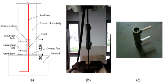 Although there are many studies on grouted splice sleeve technology, the development of reliable connections which have good force-transferring mechanisms and that are easy for construction is still a hot topic in construction industrialization and zero-carbon buildings. This paper studies a grouted splice sleeve which is very convenient for construction. The seismic performance of precast concrete columns using such a connection method is thoroughly experimentally investigated. The grouted splice sleeve connection studied in this paper for steel bars embedded in prefabricated members is shown in Figure 1a. The precast concrete column has a pre-embedded cast iron sleeve in its lower end and the vertical steel bars of the precast concrete column are inserted into the sleeve. During field installation, the steel bars extended from the pedestal are also inserted into the sleeve; then, the grouting material is poured into the sleeve. After the grout becomes congealed and hardened, the stress of the steel bars is transferred by the bond force between the rebar surface and mortar, as well as between the mortar and sleeve wall. Compared with the traditional methods of reinforcement connection, there is no external force and heat exerted on the rebar, which can prevent the rebar from expansion deformation and residual stress. Additionally, the construction operation is convenient, and the requirements on the construction precision, the quality of the construction workers, and the construction environment are not too high. The proposed bar splice sleeve is tested to be pulled out, showing a failure mode of rebar outside the sleeve yielding and then being ruptured, which meets the requirements. The pull-out test is demonstrated in Figure 1b and the sleeve configuration is shown in Figure 1c.