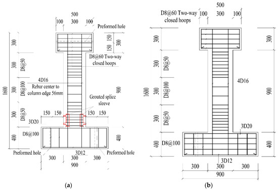 Elevation of columns (distances in mm): (a) prefabricated column; (b) cast-in-situ column. Intensity grade of rebar used in the columns is HRB400 whose nominal yield strength is , and the diameter of the preformed hole is 45 mm.