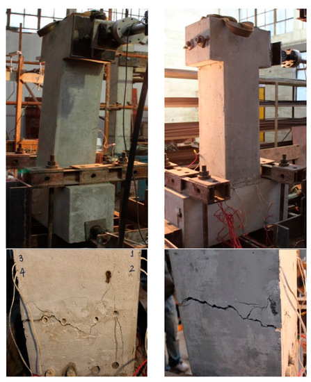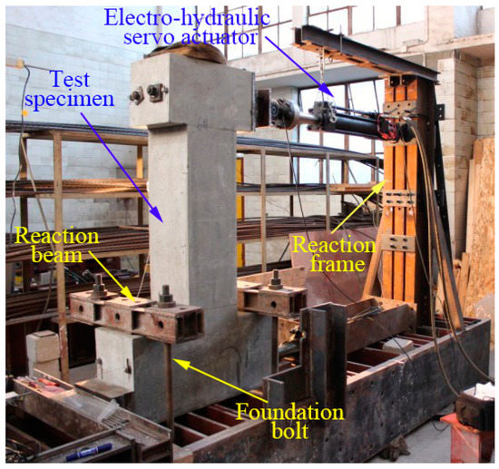 Currently, there are three main kinds of indoor seismic test methods for structural models, namely the pseudo-static test, pseudo-dynamic test, and shaking table test. The pseudo-static test, also called the low cyclic repeated loading test, has been applied to study seismic performance of various kinds of building structures or members by many scholars [36,37,38]. The experimental results obtained from the low cyclic repeated loading test, such as hysteresis loops, load-displacement curves, stiffness degradation curves, viscous damping coefficient, and displacement ductility coefficient, can indicate the seismic performance of structural members effectively, including the energy-dissipating capacity, load-carrying capability, and ductility. Furthermore, compared with other test methods, the pseudo-static test is more economic, feasible, and has few requirements on the test facility, which makes it not only convenient for researchers to watch the process of cracking and the failure status of structures, but also realizable to check the test data and the working status of the test apparatus, as well as to modify the loading process according to actual needs. Based on the advantages of the pseudo-static test mentioned above, this paper uses it as the test method.