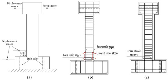 Since there is the maximum moment at the lower end of the column, four strain gauges are set at the four longitudinal steel bars at the corner. As for the precast column, an additional four strain gauges are installed at the rebar near the top of the sleeve. The detailed arrangement plan is shown in Figure 4b,c.