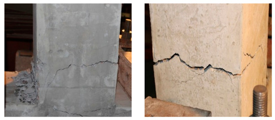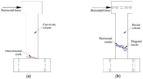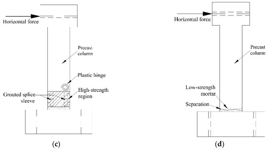 However, differences exist in the crack distribution between these two types of columns. For the cast-in-situ columns, the first crack appeared at the bottom of the column, and then it moved toward the opposite side, and finally the interconnected crack almost overlapped with the interface between the column body and the pedestal, as shown in Figure 9a. However, for the prefabricated columns, the width of the horizontal cracks at the column foot were not large, whereas the horizontal cracks above the sleeve were wide, and they propagated downward and became diagonal cracks with a large width, as shown in Figure 9b. The differences in the crack distribution between these two types of columns may be attributed to the following reasons. First, at the connection part of the prefabricated columns, the stress existing in the steel bars is transferred to the sleeve via mortar, and thus the sleeve whose tensile strength is higher than that of the steel bars replaces the steel bars to bear the loads. Furthermore, the compressive strength of grout filled in the sleeve is higher than that of concrete. Consequently, the strength of precast columns at the connection part is enhanced, making the plastic hinge move upward, as illustrated in Figure 9c; Second, for the prefabricated columns, the compressive strength of the two-centimeter-thick mortar layer is low, and thus the bonding strength between the column foot and pedestal is weak, which can possibly lead to the column body separating from the pedestal before failure, as illustrated in Figure 9d.