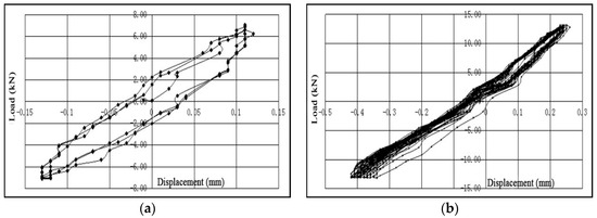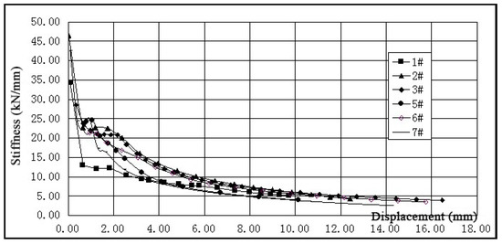 where means the secant stiffness of the specimen under the ith level load; , are the peak load values of the first circulation under the ith level load and , are their corresponding displacements. Due to the small number of load levels in the low cyclic repeated loading stage, the stiffness degradation in the failure stage is considered simultaneously, and the stiffness value is obtained from Equation (2) whose calculated results can qualitatively reflect the change tendency of stiffness degradation during the whole loading process.