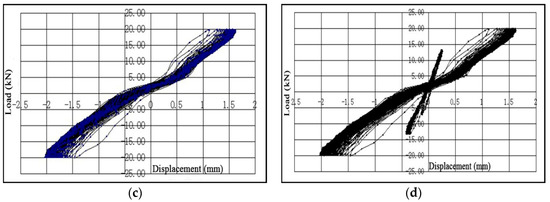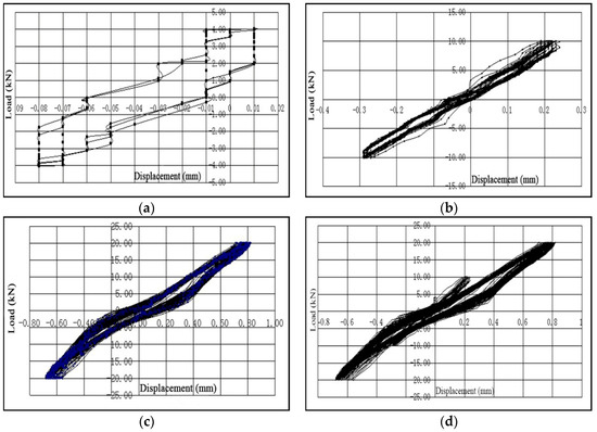 Hysteresis loops of column 5#: (a) hysteresis loops at the preloading stage; (b) hysteresis loops at the first stage; (c) hysteresis loops at the second stage; (d) hysteresis loops of the overall cyclic loading process.