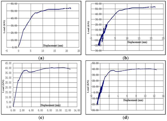 Load-displacement curves: (a) column 1# in the failure stage; (b) column 1# in the whole loading process; (c) column 5# in the failure stage; (d) column 5# in the whole loading process.