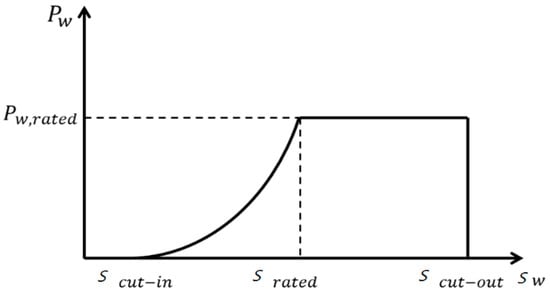 Figure 1 shows the representative power curve for a wind turbine. The cut-in wind speed is the minimum speed required to generate power. If the wind speed reaches the cut-in value, power is generated by the wind turbine. The generator produces the machine’s rated power when the wind speed reaches the rated wind speed . As shown in Figure 1, power production is almost constant between and . At the cut-out wind speed , power generation is shut down to protect the wind turbine from damage and defects, and the power output becomes zero.