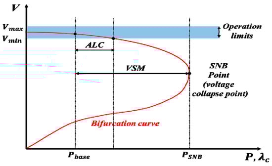 To make the system more robust against voltage-related disturbances, a suitable level of voltage stability should always be maintained in the power system. The continuation method is used as a tool for voltage security studies in [25]. In this work, the VSM is applied to measure the voltage stability, and the load is assumed to be of the constant-power type. Figure 2 illustrates the bifurcation curve between the power and the voltage. In the P-V curve, the maximum value of the loading parameter, from the base case up to the saddle node bifurcation (SNB) point, which is regarded as the voltage collapse point, indicates the VSM, which is described as the loading distance between the base case and the SNB point in voltage collapse: