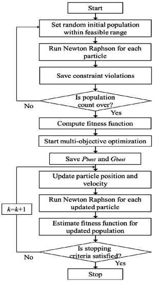 The optimization model of P-VSCOPF involves highly complicated implementations of both the objective and constraint equation differentials. To overcome the major restrictions faced by many traditional methods, evolutionary computation algorithms (e.g., PSO or differential evolution) can be used as reliable alternatives in many complex engineering optimization applications [17]. In this paper, the MOPSO based on the Newton–Raphson method is used as the optimization algorithm for the P-VSCOPF problem. The proposed MOPSO is suitable for solving constrained, nonlinear optimization problems. This technique can be managed easily, and it provides good convergence characteristics with high computing efficiencies compared to conventional PSO. Moreover, it obtains good starting values for the initial population before the PSO process begins by using the Newton–Raphson method. Thus, it offers a better performance in finding the optimal Pareto front.