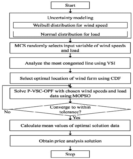 Power systems, including wind farms, are open systems. This means that any external parameter can influence their functionalities, which can lead to rather uncertain systems. The proposed OPF for CM is implemented as a P-VSCOPF, which is a nonlinear, multi-objective optimization problem. A probabilistic method has been developed using MCSs that apply random sampling of the uncertain parameter probability density function to solve the problems. In our study, a multi-objective OPF is formulated as