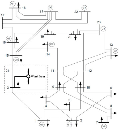 The optimal sites of wind farms with respect to CM were obtained via a CDF based on VSI. In consideration of the contingency analysis, the ten highest transmission-line VSI values were calculated, and the results are shown in Table 1. Note that the line outage between buses 3 and 24 was the most severe because it had the smallest security margin. The critical line, which had the highest security margin value, was considered a potential candidate for CM. These CDFs are obtained based on the VSI data and are given in Table 2. Higher CDFs values indicate that the lines are more critical to power transfer in the transmission lines. Table 2 illustrates that the power injections of bus 3 are the biggest influence on the power flowing through this line. Based on the CDFs results, we find that suitable wind farm locations are typically among the load-side buses. As shown in Figure 5, a wind farm was placed at bus 3, which was the optimal location regarding CM. This wind farm was composed of 300 PMSG wind turbines rated at 2 MW each. The total wind power capacity of 600 MW represented approximately 20% of the total generation capacity.