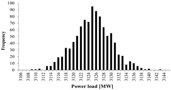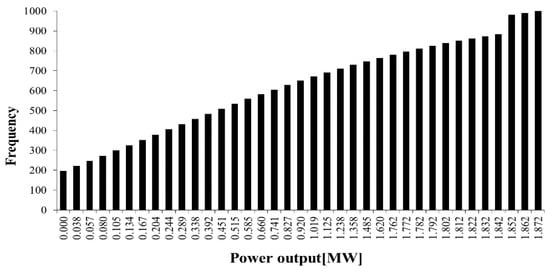 In consideration of the probabilistic variability of both wind speeds and loads, an MCS is conducted to select both the wind power and the system load as input variables. To estimate the Weibull parameters of wind speeds, two years of historical wind speed data were collected from a wind turbine in Seongsan-eup on Jeju Island, South Korea [29]. These data were used as the input for a 2-MW PMSG wind turbine. Our study assumed that wind power generation consumes no fuel. Figure 6 illustrates the cumulative distribution curve of the power output based on a 2-MW wind turbine using an MCS with 1000 samples. The mean value of the wind power output is approximately 1 MW. The normally distributed system load uncertainty is shown in Figure 7. It is considered using the mean value of the period in which congestion occurs more frequently. For statistical purposes, the normal distribution representing the load uncertainty can be obtained with a standard deviation of 5%.