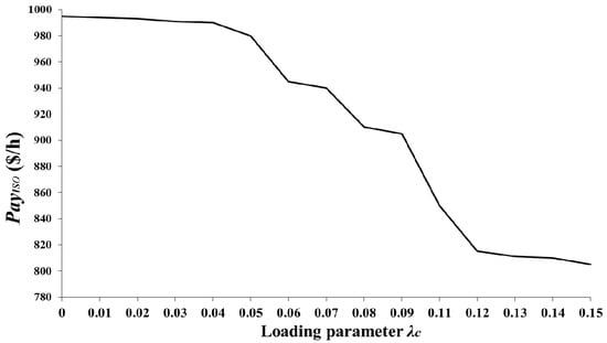 To verify the effectiveness of the proposed approach, the performances of conventional OPF, VSCOPF, and P-VSCOPF with respect to CM were compared for the modified IEEE-24 bus system. In our study, all three methods were utilized to consider the optimal installation of the wind farm in bus 3, which is obtained through a CDF based on VSI. However, both conventional OPF and VSCOPF, which take into account only the mean values of loads and the wind farm’s output, do not consider the probabilistic effects between the loads and the wind farm’s variability. Meanwhile, P-VSCOPF consists of two parts: an MCS for selecting both the wind output and load input variables and MOPSO for solving the multi-objective optimization problem. It was implemented based on 1000 MCS trials. Table 3 presents the optimal solution results for P-VSCOPF. Note that these results represent the mean values of 1000 MCS trials based on MOPSO. The power generation (PG) in bus 3, which was connected to the wind farm, was 295.1 MW. This value was determined by the performance of 1000 MCSs with probabilistic variables taken into account. Figure 8 reveals the estimates of the Pareto optimal front, which relates PayISO and the loading parameter . Note that the Pareto optimal front of the test system exhibits highly nonlinear relationships between the social welfare and the voltage stability margin. A suitable range for the weighting factors is approximated to be 0.4–0.8. In fact, for values smaller than 0.4, system security can almost be ignored, and for values higher than 0.8, market power will happen. On the other hand, with respect to the weighting factors within this range, an importance of between 0.4 and 0.8 was assigned to the voltage security. Therefore, we assume that the results of our work apply to test systems with = 0.6.