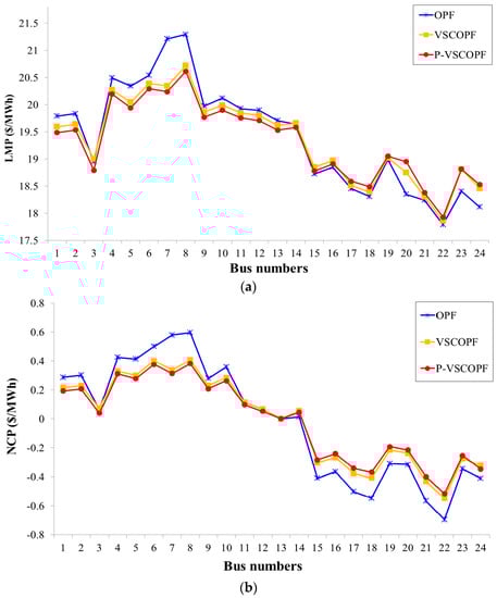 Figure 9 compares the LMPs and the NCPs. As shown in Figure 9a, for CM, the LMP differences were less with P-VSCOPF than they were with either the conventional OPF or VSCOPF. It is clear that the congestion problems were resolved by minimizing the LMP differences and then maintaining them at the lowest possible levels. As shown in Figure 9b, the range of NCP values was −0.6954 to 0.5962 $/MWh. Here, NCP values at bus 13 (the slack bus) were zero. Lower NCP values indicate lower congestion in the test system. The congestion mitigation of P-VSCOPF was the most effective among those of all of the methods, since the NCP of P-VSCOPF was the lowest. A comparison of the results obtained in each case reveals that the best solution for CM was obtained with P-VSCOPF. Consequently, appropriate realizations of both the voltage stability constraints and the contingency analyses not only result in a better distribution of electricity prices but also reduce the influence of system congestion.