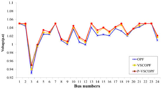 To evaluate the ongoing security after CM has been executed, the voltage profiles of the buses for the three methods are shown in Figure 10. The horizontal and vertical axes represent the bus numbers and the voltage magnitudes, respectively. A good voltage profile is one of the indications of a more secure power system. The voltages of P-VSCOPF are the highest among all methods for all of the buses. Thus, P-VSCOPF not only provides a greater stability margin but also leads to a better voltage profile than the other OPF methods do. This means that the system is more robust and can maintain stability even under the most severe circumstances.