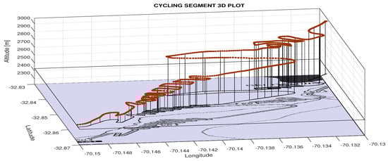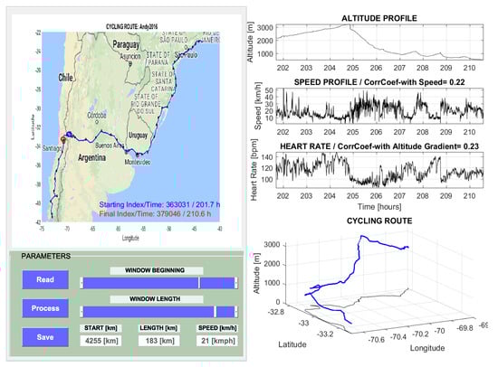 The present paper is devoted to the analysis of cycling data acquired with a global positioning system (GPS) [,,,,] used to record the spatial location of a cyclist using his longitude, latitude, and altitude, together with his heart rate []. Figure 1 presents a data segment selected from the whole 5694-km-long cycling route across the Andes mountains that provided data for the long-term analysis of the fitness level in different route conditions and the altitude profile. Figure 2 presents details of this cycling route segment.