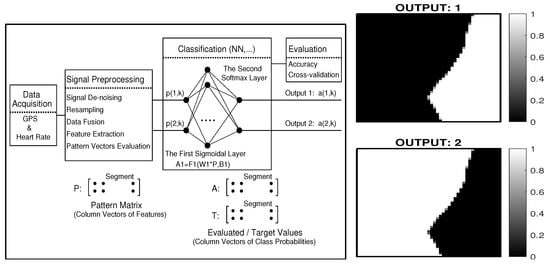 Cycling segment features formed the corresponding column of the pattern matrix , as specified in Figure 4. For each cycling segment, three features forming a column vector were evaluated: the heart rate, speed, and the delay of the heart rate change after the change of the gradient altitude. This pattern matrix was then used for classification by the two-layer neural network evaluating values