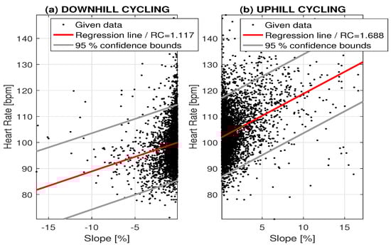 Figure 5 presents the analysis of the changes in the heart rate related to altitude gradients along the cycling route in segments of 10 min divided into downhill and uphill cycling, with regression coefficients 1.117 and 1.688, respectively. The method was based on a correlation analysis [] within the selected segments.