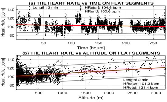 The analysis of the heart rate on flat data segments is presented in Figure 6 for two-minute data windows. Figure 6a presents the decrease of the mean heart rate in segments below an altitude of 800 m, owing to the increasing fitness level. During the 272.2 h of cycling, this mean value decreased by 4 bpm: from 104.6 to 100.6 bpm. Figure 6b presents the increase of the mean heart rate related to the mean altitude of each segment. This mean heart rate increased by 20.2 bpm from 101.2 to 121.4 bpm for altitudes ranging between 0 and 3200 m above sea level.