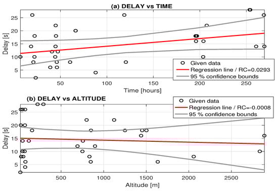 In a similar way, Figure 7b presents that delay related to the altitude, with its decrease being caused by climate conditions and the decrease in air pressure with increasing altitude. The regression line presents its decrease from 15.3 s to 11.0 s for altitudes ranging between 0 and 3200 m above sea level.