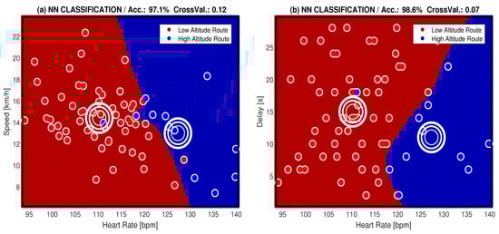 Figure 8 presents the classification of selected cycling segment features by the neural network structure specified in Figure 4 into two classes defined by cycling in areas with their mean altitude (observed and recorded by the GPS system) less than 1500 m (class ) and greater than 1500 m (class ). The mean heart rate was higher for high-altitude cycling (Figure 8a), and the mean delay between the change of the heart rate to gradient altitude was lower for cycling in higher regions (Figure 8b). The summary of mean values of selected cycling features (heart rate (HR), speed, and the delay in the change in the heart rate vs. gradient of altitude) for classification into two classes (—mean altitude less than 1500 m and —mean altitude greater than 1500 m) is presented in Table 2.