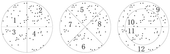 Likewise, in the transverse direction, the specimen was scanned with Computed Tomography (CT) at an interval of 13.5 mm. Each image was divided into 12 segments for the evaluation of distribution uniformity. After Image 1 was segmented, anti-icing filler points were marked, as illustrated in Figure 5 and Figure 6.