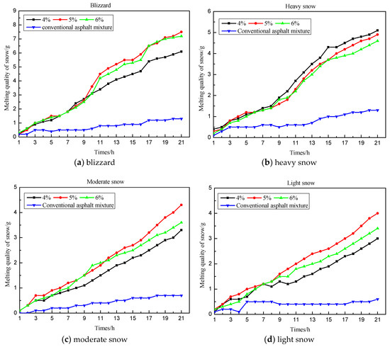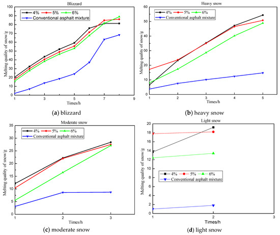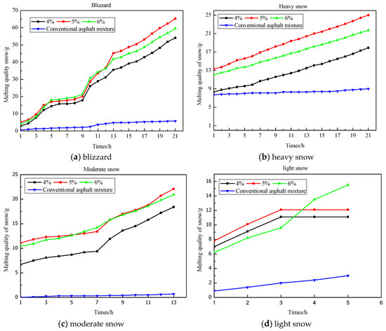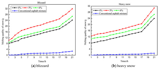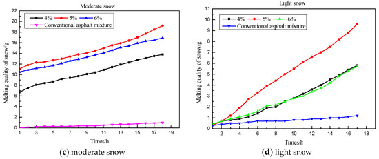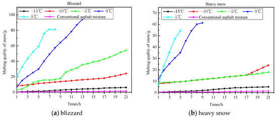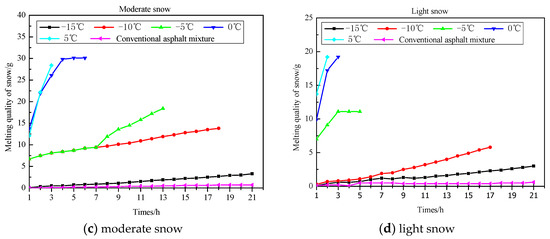 It can be observed that moderate snow was melted within 18, 13, 6 and 3 h at −10, −5, 0, and 5 °C, respectively; light snow was melted within 17, 5, 3 and 2 h at −10, −5, 0, and 5 °C, respectively; snow from a blizzard was melted within 13 and 5 h at 0 and 5 °C, respectively; and heavy snow was melted within 9 and 8 h at 0 and 5 °C, respectively. The melting rate rose with the increase of temperature. Under same snowfall intensity, anti-icing filler spent less time on melting the snows with same masses at a higher temperature. It is indicated that the snow-melting effect of anti-icing admixture is strongly dependent on temperature. The melting effect is weak at low temperatures.
