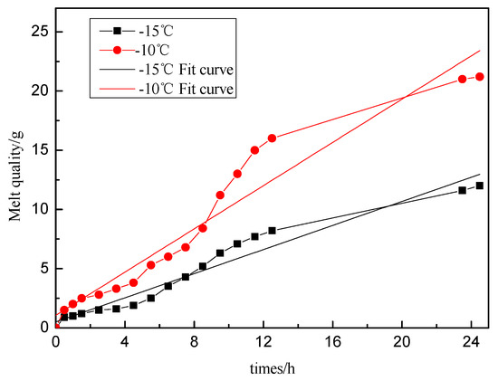 Moreover, IGD was also selected as the anti-icing filler for validating the above-described regression results. The experiments were conducted following the gradation in Section 2.2.1 (4.8% asphalt-aggregate ratio, 5.0% mass ratio of IGD to asphalt mixture, and 5.0% mineral powder). The experimental results are shown in Figure 15, and the regression results are shown in Equations (8) and (9). The melting rate also corresponds with the linear relationship, and the melting rate of the above two temperatures has a nearly twofold relationship. Besides, the snow melting performance of anti-icing asphalt mixture with IGD is approximate to that of anti-icing asphalt mixture with V-260 in a short term.