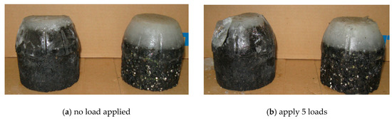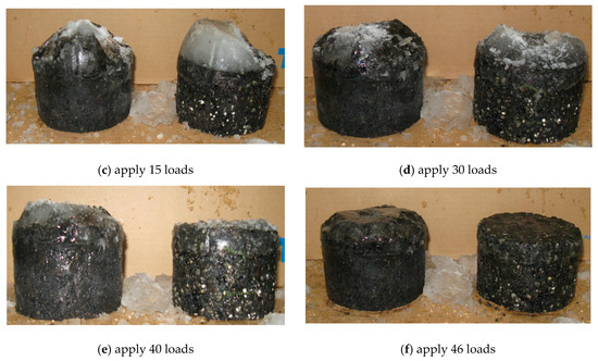 The frozen specimens were placed on a Marshall Compaction Apparatus, (Chang Sha Ya Xing Digit-Control Limited Company, Changsha, China) and the impact load produced in the hammer’s free fall was calibrated with an impact sensor. The height was adjusted so that the impact load equaled to 100 KN (standard axial load). According to the frequency of the vehicles passing through a section, the impact frequency was 30 times per minute. The number of impact was recorded until the ices over the specimen were completely cleared.
