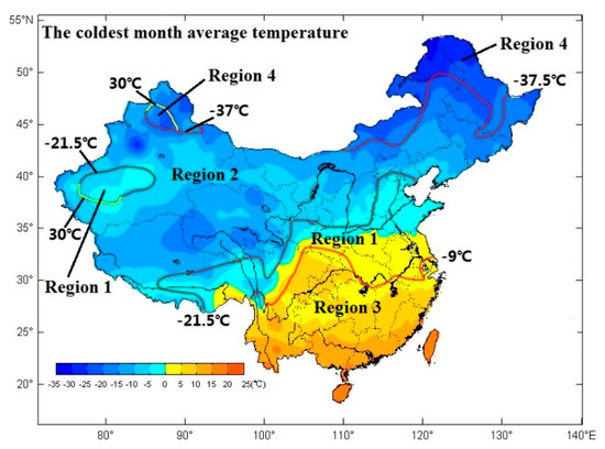 Four regions of the anti-icing asphalt mixture application climate zone have been identified as follows: Region 1, which is denoted as the chilling region, and the extremely minimum temperature range is between −9 and −21.5 °C; Region 2, which is denoted as the cold region, and the extremely minimum temperature range is between −21 and −37 °C; Region 3, which is denoted as the warm region, and the extremely minimum temperature is above −9 °C; and Region 4, which is denoted as the severely cold region, and the extremely minimum temperature is below −37 °C.