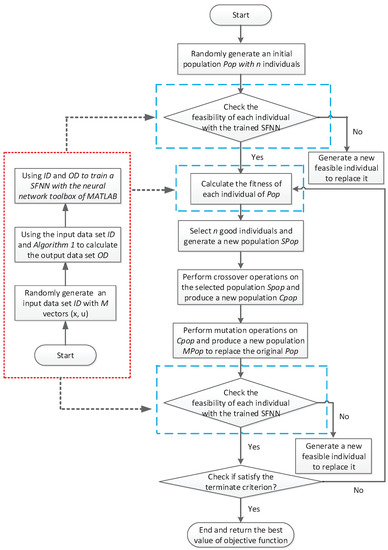 GAs with the basic evaluation, selection, crossover and mutation operators is employed. The first step of GAs is to generate an initial population. According to the objective function defined in Equation (17), it can be easily found that the task of HIA is to get the best control decision serial at each control step . Since the size of each vector of the decision serial is assumed to be equal to m, variables are needed to be optimized at the beginning of each control step. Each variable is coded with L digits of binary number. The length L is determined by the desired representation accuracy [38]. Although there are a number of ways to make selections, a nonlinear selection strategy is adopted in this study. It is worth noting that the feasibility of the offspring individuals (generated by crossover operation or mutation operation) should be checked with a neural network created by Algorithm 1. In addition, to help readers to better understand the main idea of the proposed algorithm HIA, Figure 2 illustrates the scheme diagram of HIA.