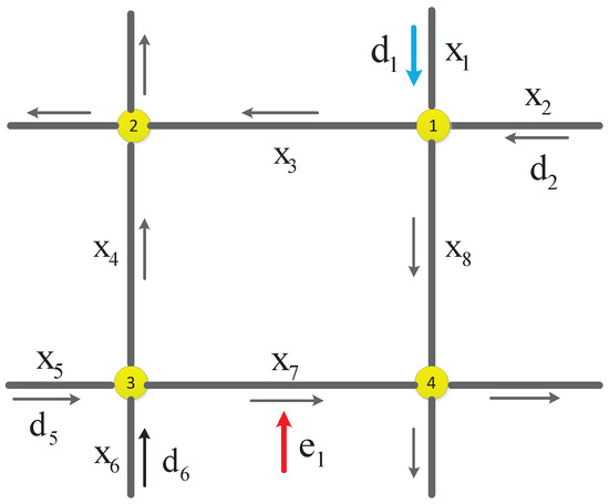 where () and are the inflow (outflow) and the disturbances (e.g., unexpected traffic fluctuations caused by accidents or parking garage) of link r, respectively. In fact, Equation (1) describes the “vehicle-conservation” on the link r. It should be noted that Guarnaccia [32] has cleverly used the “Kirchhoff Current Law“ to define the “vehicle-conservation” of an intersection.