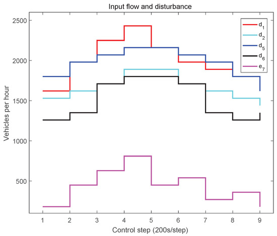 Table 1 shows some basic parameters that will be used in the simulation. The turning rates and input traffic flow are illustrated in Table 2 and Figure 4, respectively. The initial state (the number of vehicles on each link at the beginning of the first control step) of the test network is randomly generated. For instance, denotes that the number of vehicles on the link is randomly generated in the interval . Herein, . According to the length of each link and the average length of each vehicle (as defined in Table 1), we set for the link and for the rest links. Herein, denotes the maximum number of vehicles that can be accommodated in a link. For simplicity, we assume that uncertainties only exist on link and link . Furthermore, we assume that the uncertain traffic flow and disturbance are both normally distributed. Aiming to demonstrate the performance of the proposed HIA, the traffic flow and the disturbance shown in Figure 4 are, respectively, assumed to be the mean value of the input flow of and the disturbance of . Furthermore, and are both estimated by historical data. As shown in Table 3, the covariance matrix of and are defined as and , respectively. Note that, for computational simplicity, we assume the covariance matrix and remain unchanged during the whole simulation period. Since previous studies [20,21,22] have shown that it seems reasonable to select the prediction horizon , the experiment results reported in this study are all achieved under the condition that . As a result, the covariance matrix and are three-dimensional matrices. For the measure of solution quality, we report the queue length and the green time of each link in the test network over a simulation period of 20 min (that is six simulation steps).