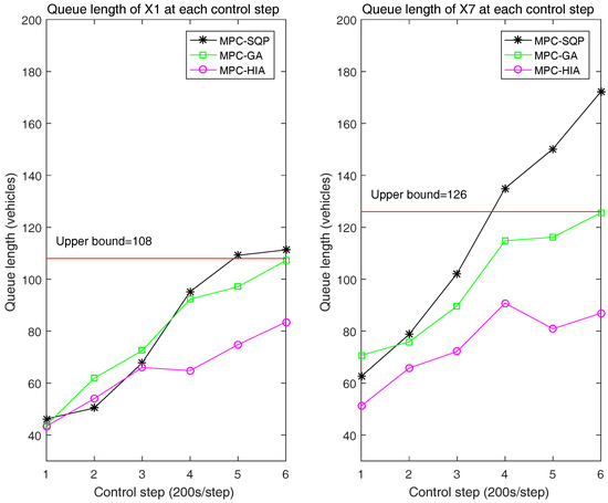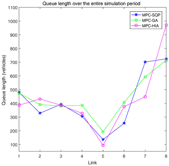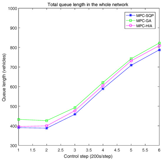 For each control step, the performances of the three models (MPC-HIA, MPC-GA and MPC-SQP), in terms of the total queue length of the network, are illustrated in Figure 8. It can be seen clearly that MPC-SQP performs better than MPC-HIA during the entire simulation period. This may be because, compared with MPC-SQP, there are chance constraints that are imposed on the queue lengths in MPC-SQP. However, MPC-HIA performs better than MPC-GA over the whole simulation period. This is perhaps due to the fact that the stochastic MPC model (MPC-HIA) has better performance than the deterministic MPC model (MPC-GA) in terms of dealing with uncertainties, which are imposed on link and link .
