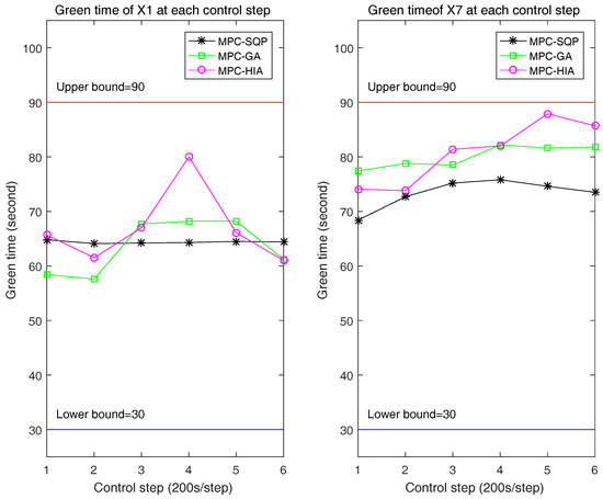 For the sake of simplicity, let MPC-SPQ denote a deterministic MPC model () that was solved by Sequential Quadratic Programming (SQP), and MPC-GA denotes a deterministic MPC model () that was solved by Genetic Algorithms (GA). In order to demonstrate the performance of the proposed stochastic MPC model that was solved by HIA (abbreviated as MPC-HIA), the performance is compared with MPC-SPQ and MPC-GA. Firstly, the objective functions both of and are the same and defined as and the Equation (18). In addition, except that there are no chance constraints imposed on the queue length (as defined in Equation (12)), the rest constraints of the model are the same as those of the proposed stochastic MPC model. Except for the chance constraints (as defined in Equation (12)) being replaced by the deterministic constraints (as defined in Equation (11)), the rest constraints of the model are the same as those of the proposed stochastic MPC model.