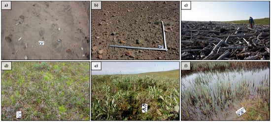 Example in situ imagery of select land cover classes of interest: (a) sand (BS); (b) mixed sediment (BM); (c) driftwood accumulation (BW); (d) herb dominated tundra (HT); (e) shrub dominated tundra (ST) and (f) wetland (WT). Photos were taken in 2012 on the Tuktoyaktuk Peninsula by Tobias Ullmann.