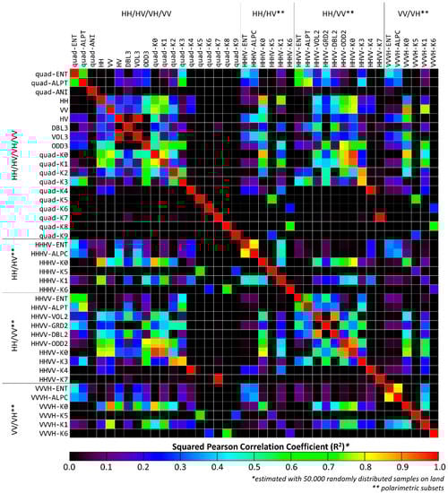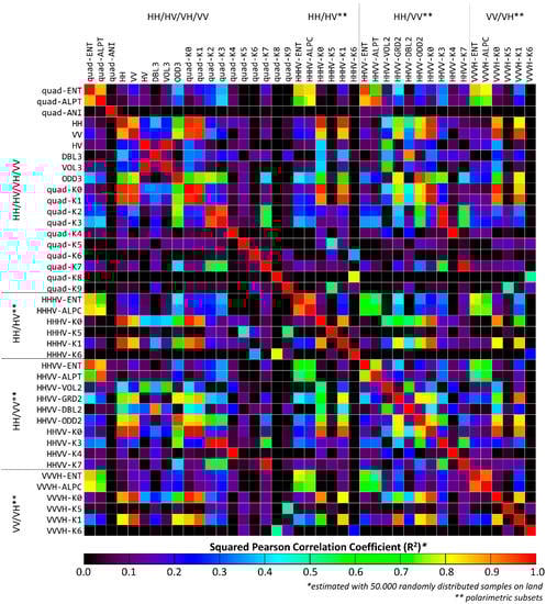Correlations among the decomposition features of dual- and quad-polarized data were investigated prior to the assessment of the backscatter characteristics of the land cover classes and the separability of classes. The squared Pearson Correlation Coefficient (R2) was derived using the 50,000 randomly distributed samples on land, and which represented 10% of all land pixels inside the common coverage of the TSX, ALOS, ALOS-2 and R-2 imagery. Results were drawn as correlation matrices for the features of C-Band data of R-2 in Figure 3, for features of L-Band data of ALOS-2 in Figure 4.