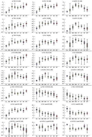 Figure 5 provides boxplots—showing the minimum, lower quartile (25%), median (50%), upper quartile (75%), maximum—of the land cover classes (see Table 2) for select polarimetric features of X-Band (TSX), C-Band (R-2) and L-Band (ALOS and ALOS-2). Figure 5a–i display the backscatter characteristics of the land cover classes concerning the HH, HV and VV sigma nought intensities in decibels (dB). Figure 5j–o shows the information of the model-based (power) decomposition features of the Yamaguchi Decomposition of C-Band (R-2) and L-Band (ALOS-2) as DBLB3, VOL3 and ODD3; in dB. Figure 5p–x shows the boxplots of the land cover classes for the Kennaugh Matrix elements K0, K3 and K4 of HH/VV-polarized X-Band (TSX), quad-polarized C-Band (R-2) and quad-polarized L-Band (ALOS-2) data in dB.