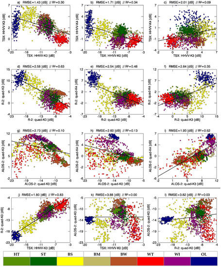 Scatterplots of the land cover classes OL (Permanent Water Bodies), BS (Sand), BM (Mixed Sediment), BW (Driftwood Accumulation), HT (Herb Dominated Tundra), ST (Shrub Dominated Tundra), WI (Inundated Low Lying Tundra) and WT (Wetland) (see Table 2) for: (a–c) Kennaugh elements K0/K3/K4 of HHVV-polarized X-Band (TSX); (d–f) Kennaugh elements K0/K3/K4 of quad-polarized C-Band (R-2); (g–i) Kennaugh elements K0/K3/K4 of quad-polarized L-Band (ALOS-2); (j–l) Kennaugh element K0 of TSX, R-2 and ALOS-2. In the figure title the Root-Means-Square-Error (RMSE) and the squared Linear Pearson Correlation Coefficient (R2) are drawn.