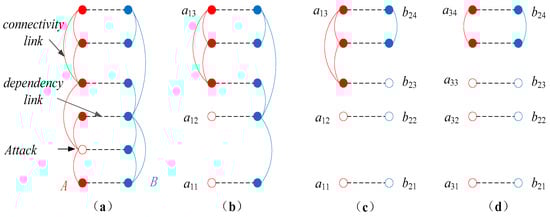 Cascading failures of interdependent networks []. Red and blue nodes represent nodes of subnetwork A and subnetwork B, respectively. Solid circles denote functional nodes, hollow circles denote failure nodes. (a) One node in sub network A is chosen to be attacked; (b) the attacked node in A and its dependency counterpart in B fail, and all of the links of the failure nodes, including connectivity and dependency links, are removed. Then A breaks into three clusters, and only nodes in cluster a13 remain functional according to the assumption; (c) because of the dependency and larger cluster, cluster b21, b22, and b23 in B are eliminated; and (d) failure of cluster b23 in turn leads to failure of some nodes in A, and cascading failures stop because no further failure occurs. Finally, only nodes in cluster a34 and b24 remain functional in the interdependent networks after only one node in subnetwork A is attacked.