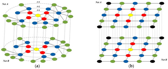 According to the emphasis, the existing research can be divided into two aspects: one is to study the influence of the topology of subnetworks; the other is to analyze the influence of the dependency links between subnetworks on the robustness of interdependent networks. The topology of subnetworks, such as the degree of distribution [,], clustering coefficient [,,], and assortative [], is an important factor affecting the robustness of interdependent networks, and most recent works are carried out from this perspective. Moreover, these studies are often carried out in the context of different attack strategies and coupling preference [,,,,,]. Attack strategy is the method of selecting attack nodes, such as random attack (RA), targeted attack (TA) [,], and localized attack (LA) [,,,,]. Coupling preference refers to the pattern that the coupling links are established between subnetworks [,], including assortative, disassortative, and random coupling, based on node degree or betweenness. The other factor affecting the robustness of interdependent networks is the dependency link, including coupling strength, link strength, and the direction of the link. First, interdependent networks can be divided into fully and partially-interdependent according to coupling strength, which means the partition of nodes with dependency links. This coupling strength leads to a change from a first-order to a second-order percolation transition at a critical threshold [,,]. Next, strong and weak coupling can be identified according to the strength of the dependency link, or, for example, the probability of node failure after losing its dependency link, as there is a rich phase transition of interdependent networks when the strength of the dependency link changes []. Finally, the direction of the dependency link distinguishes directed and undirected interdependent networks [,]. A directed interdependent system has poorer robustness performance than an undirected system, the main reason being that there are more possibilities for the existence of longer dependency chains in directed interdependent systems than undirected ones.