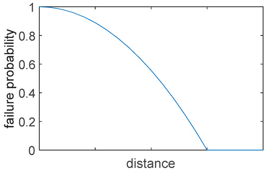 A localized attack is often used to simulate the impact of natural disasters on interdependent systems. In a localized attack scenario, nodes are chosen from a certain area, starting from a root node, then its nearest neighbors, then the next nearest neighbors, as shown as Figure 2, until the fraction of affected nodes reach a certain value, denoted by p. The traditional localized attack (TLA) assumes that all of these nodes will fail. However, the fact is not like that. It is a basic fact that destructive force usually decays with distance, and there is a distance threshold, L0, beyond which the probability of node failure is 0. Additionally, for earthquakes, the closer to the epicenter, the slower the destructive force increases []. Simple and without generality, we assume the failure probability of a node at the epicenter is 1. Thus, we can define a new failure probability degradation model of a localized attack (PDLA), as shown as Figure 3, and the failure probability of one node with distance l from the attack center is as follows: