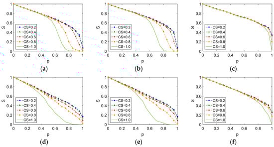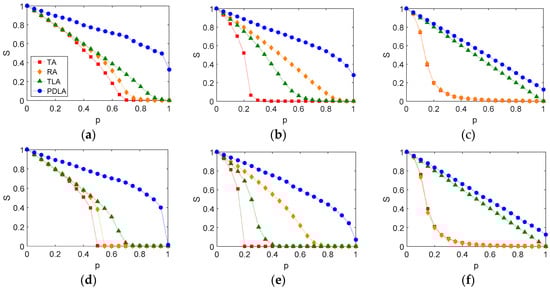 In addition, by comparing Figure 8b,c and Figure 8e,f, we find that when the average degree of the subnetwork increases from four to six, the robustness of interdependent networks under different coupling strengths is very similar. It is suggested that the robustness of interdependent networks with different coupling strengths under PDLA is related to the average degree of the subnetworks. When the average degree is small, larger coupling strength makes interdependent networks more vulnerable; but when the average degree is large, the coupling strength has little effect on the robustness of interdependent networks. This is an interesting phenomenon worth further research.