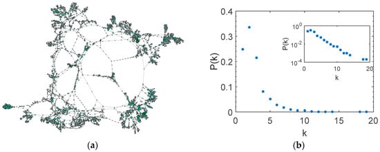 To analyze the robustness of interdependent infrastructure networks when facing disasters, such as earthquakes, the robustness of an interdependent cyber-physical network, consisting of an infrastructure network, the western states power grid network of the United States, as shown in Figure 5a, and its control network, are analyzed under PDLA in this section. The node number of the power grid network Npower = 4941, the edge number is 6594, the average degree <Kpower> ≈ 2.67, the clustering coefficient C = 0.107, and the average shortest path length APL = 18.989. Figure 4 shows the illustration and degree of distribution of the power grid network. Due to the lack of computer control network data, we use a BA scale-free network instead [,], with NBA = 4941 and <KBA> ≈ 4, to construct power-BA interdependent networks.