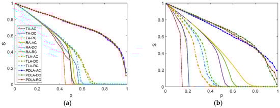Secondly, compared with the results of WS-WS and BA-BA in Figure 4c,f, the robustness of the interdependent power-BA networks in Figure 6b show the same, but more severe, decreasing trend with the increase of the attack area. In the scenario of a targeted attack, the entire interdependent networks will completely collapse with a critical threshold pc around 0.04. Even in the PDLA scenario, the critical threshold pc is 0.42, much less than that in WS-WS and BA-BA.