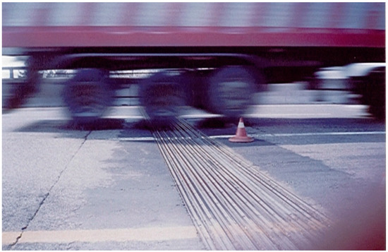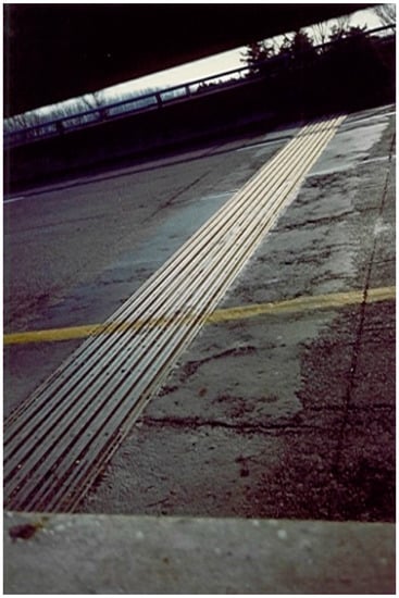 In the last five years, an accident rate higher than the national average value [33] was found for the examined Italian highway. Many accidents were localized in correspondence to a bridge and, in particular, near one of the BEJs present in this area. After a brief in situ inspection, it was found that a reduction of the contact area between vehicles’ tires and pavement took place in many cases during the passage on this BEJ, and sometimes, there was a complete loss of contact, as shown in Figure 3.