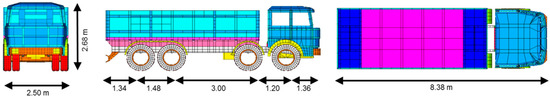 The test vehicle model (Figure 8) was initially built to perform roadside hardware crash test simulations [35,36,37]. It is the IVECO FIAT 180 NC, IVECO (Group CNH Industrial), Torino, Italy, 4-axle heavy goods vehicle, with a net mass of 10,560 kg and a total mass of about 30,000 kg. Its model consists of about 12,000 shell, 150 solid and 100 beam elements (in total, about 15,000 elements).