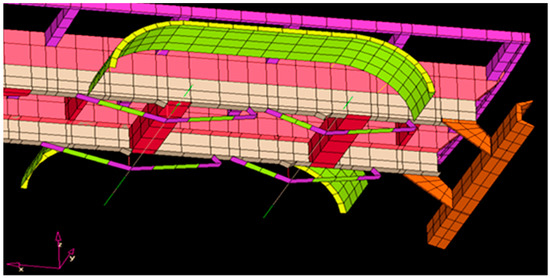 In addition to the in situ measurements, a simulation model was implemented. In particular, a 3D model of the asphalt concrete pavement and the seismic BEJ was developed using LS-DYNA. It allowed evaluating the stress magnitude on the test heavy vehicle mechanical components (Figure 6) due to the vertical irregularity that characterizes the BEJ. For this reason, the vehicle is modeled in detail, while for the BEJ, a simple geometry, able to describe the unevenness, was considered. In addition, only the concrete slab was modeled to reduce the computational burden, its bottom surface being fully constrained.