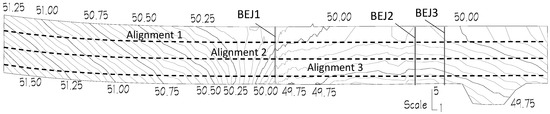 The geometric-topographic measurements permitted plotting the level curves of the surveyed pavement area, which is characterized by the presence of three BEJs marked as BEJ1, BEJ2 and BEJ3 (Figure 12). In particular, three different longitudinal alignments, highlighted in Figure 12, were examined.